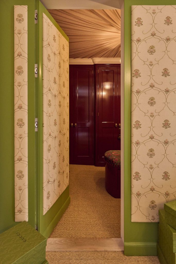 This distinctive green flows seamlessly across the bespoke wardrobes, crafted by Chamber Furniture to Lyn’s precise specifications and tailored to the client’s individual clothing collection. Each wardrobe door is etched with fine brass inlays, echoing the antique pendant light overhead, adding a further layer of quiet grandeur. Even the tassels and passementerie take their cue from Gucci, lending subtle couture-inspired flourishes that elevate the room into a realm where fashion and interior design beautifully converge.