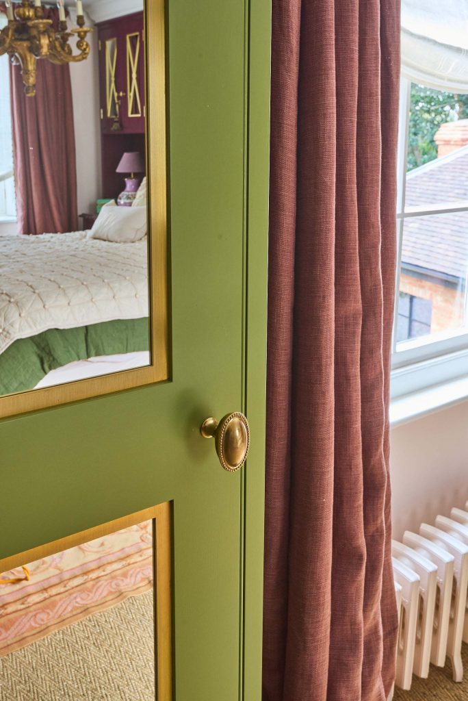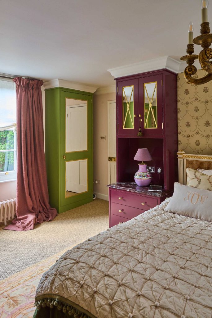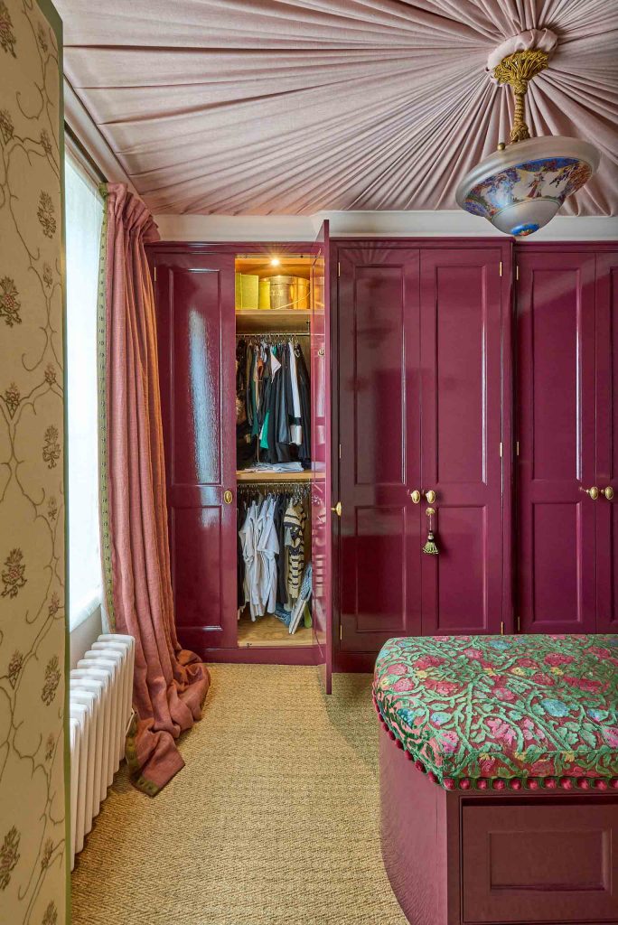 Beyond the secret door, the dressing room unfolds in a rich palette of burgundy lacquer. Here, Chamber Furniture crafted Catalan shaker-style wardrobes fitted with carefully chosen Beardmore handles, allowing the vibrant treatment to shine.