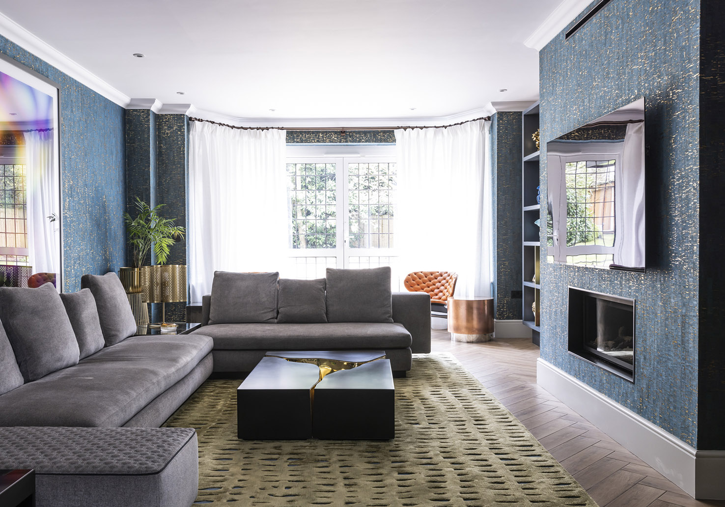 Display cabinets for ornaments and photos, finished in Little Greene Hicks Blue, feature recessed shelf lighting. The open cabinets have a wallpapered back for added detail.