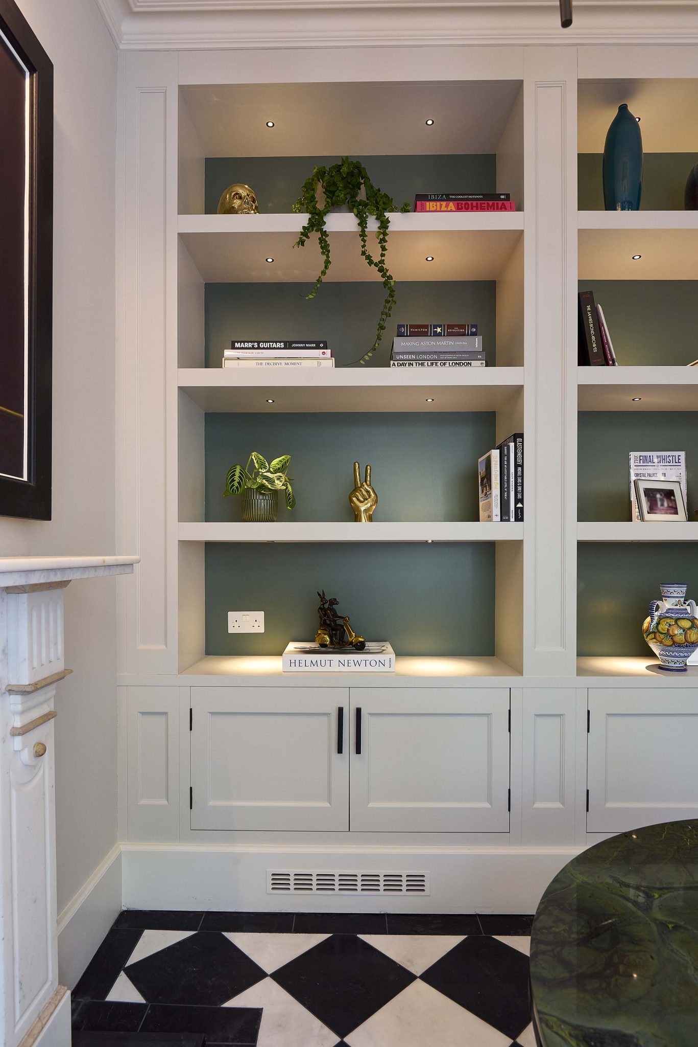 Built-in bookcases, hand-painted in Paint & Paper Library Slate IV 164, with a contrasting colour on the backs.