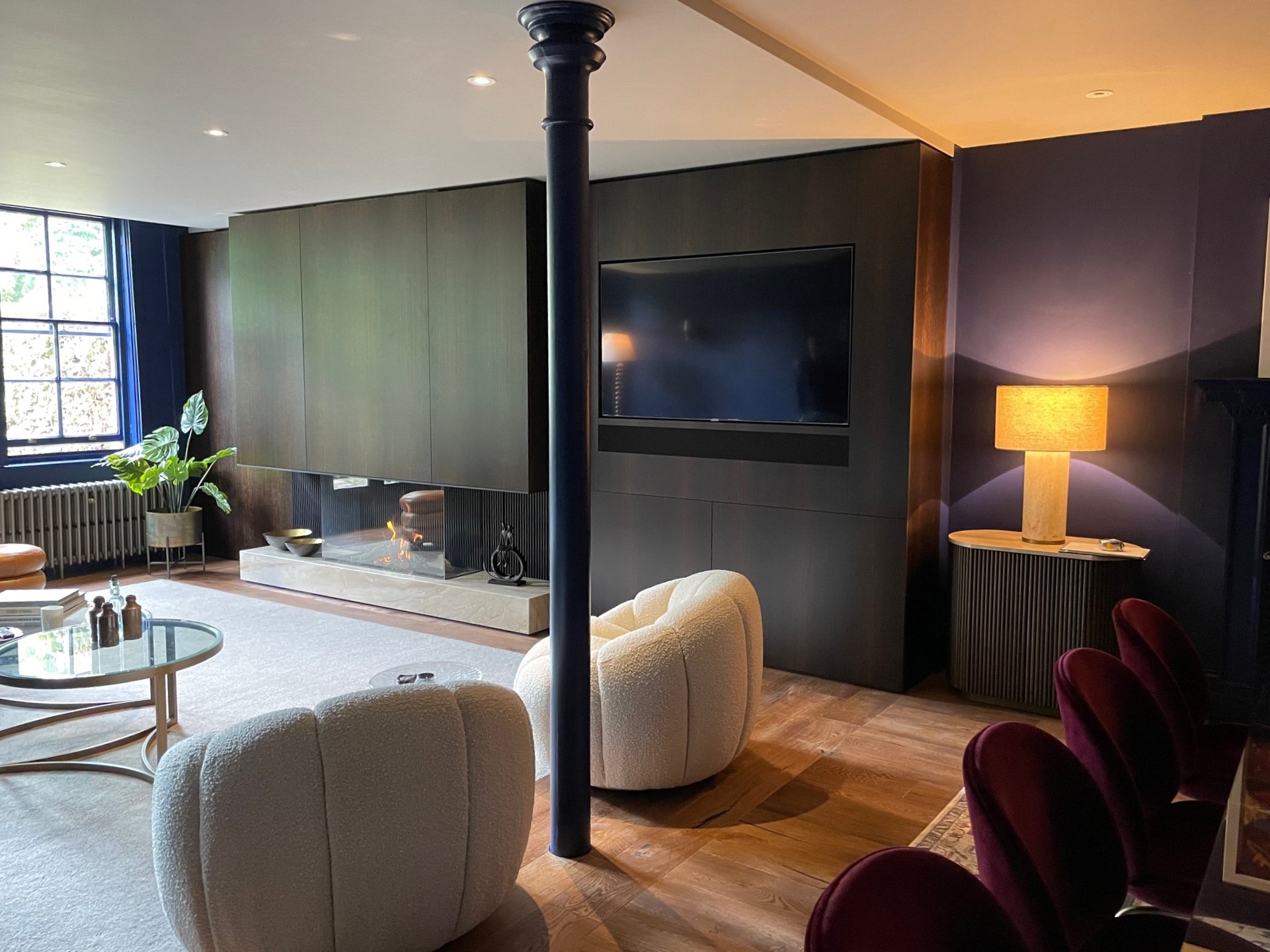 Flush variegated fumed eucalyptus fireplace wall with concealed storage and TV. Two lozenge shaped reeded occasional tables with concealed storage below on touch latches and marble top.