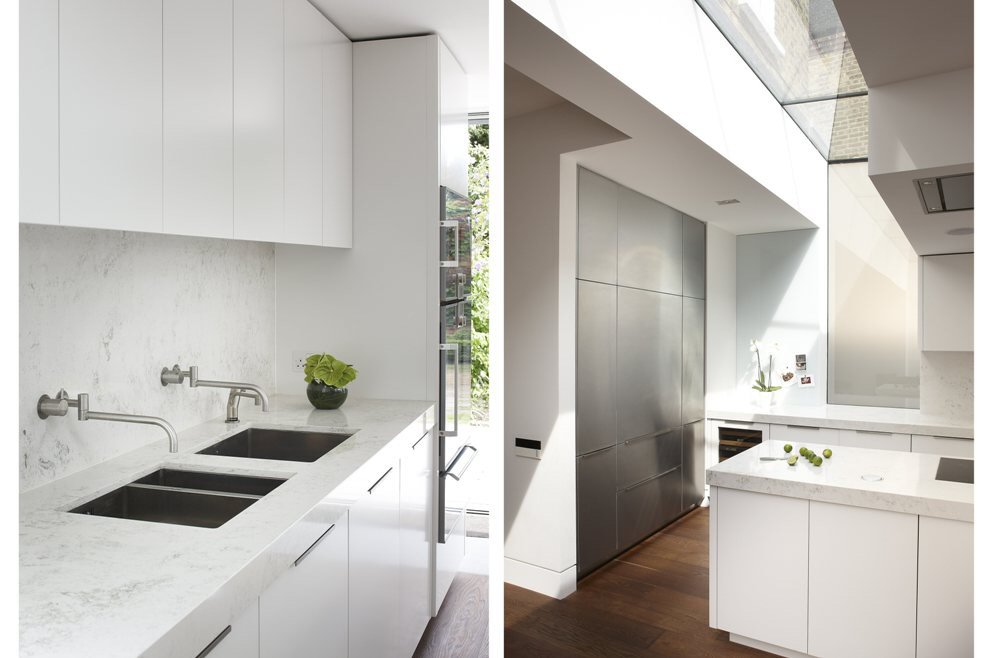 Clean, crisp lines of white cabinetry cleverly reflect light throughout the room, highlighting the angular features in this architectural contemporary home. The touch latch handles provide an uninterrupted view on the flush cabinets in this minimalist kitchen.