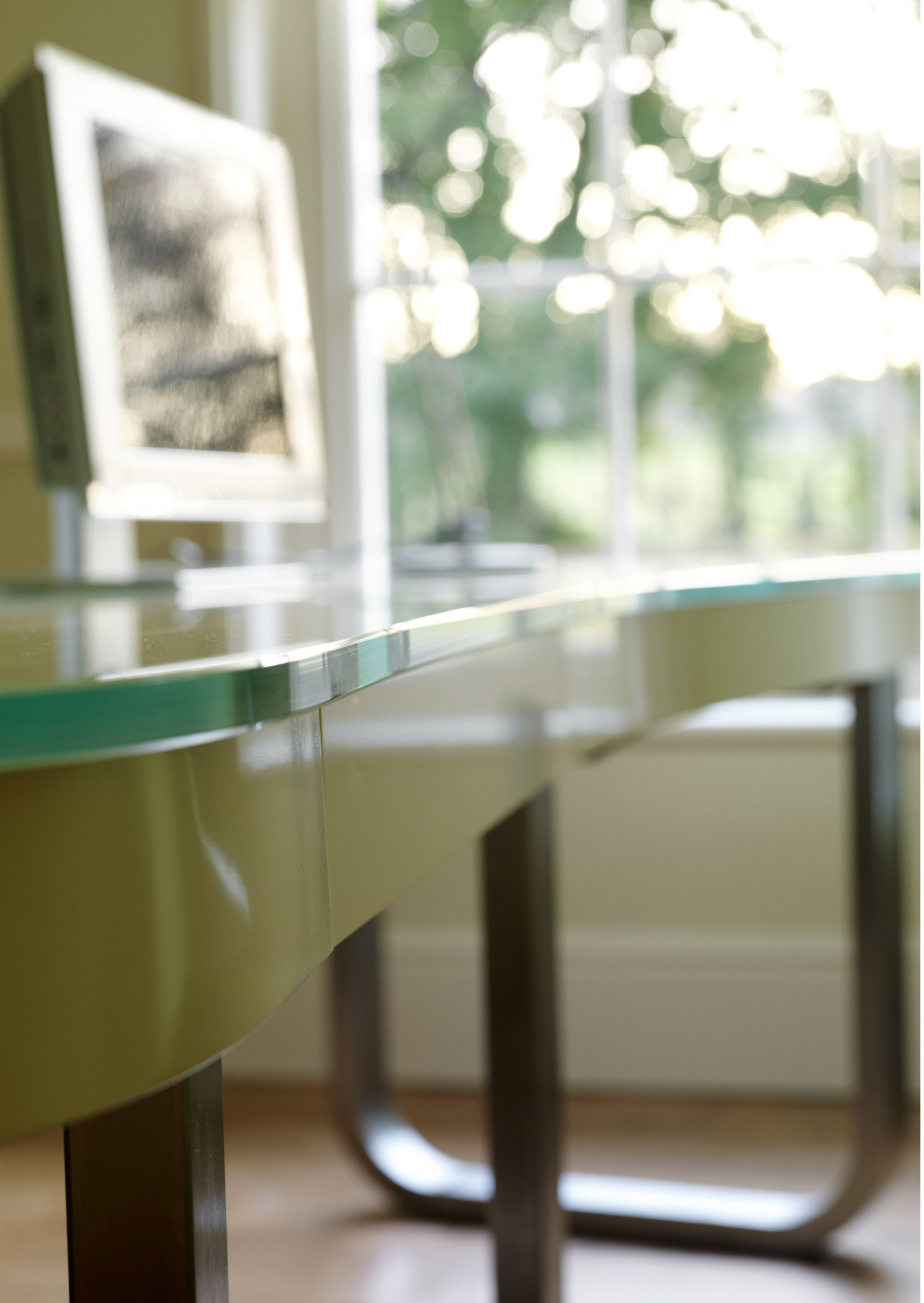 Shades of lime green create a calm sanctuary for study in this family home. The 'floating' home office furniture provides an abundance of hidden storage, ensuring the space can be kept clutter free. This curved and contemporay, double seated desk features a gentle sweeping glass top; adding a modern design statement to this traditional home.
