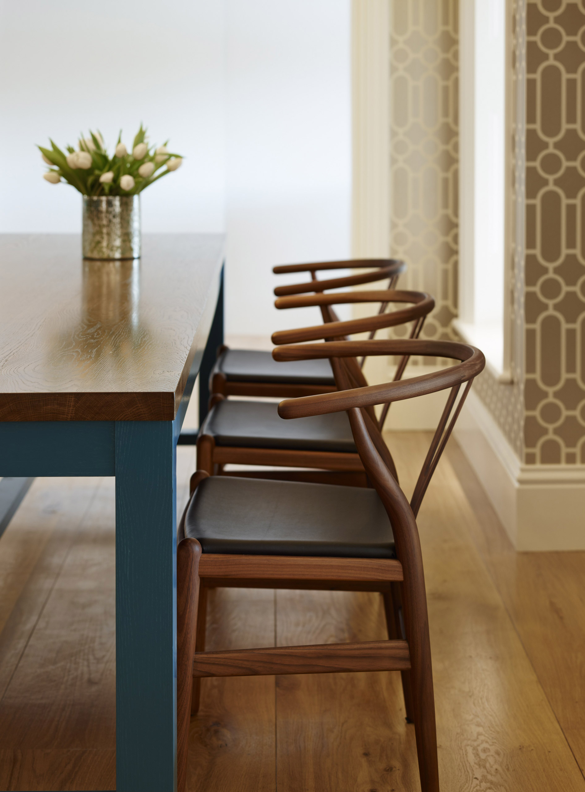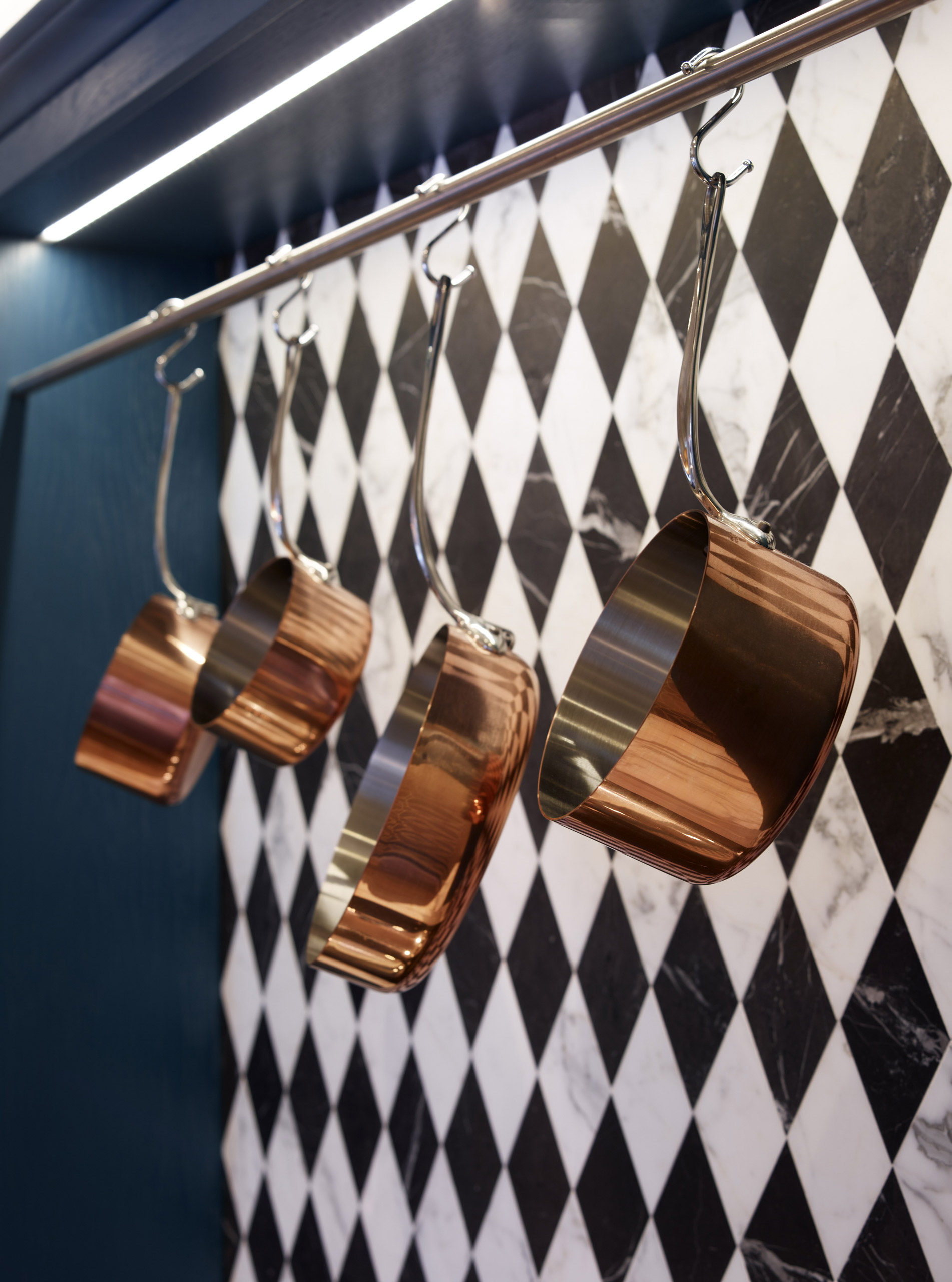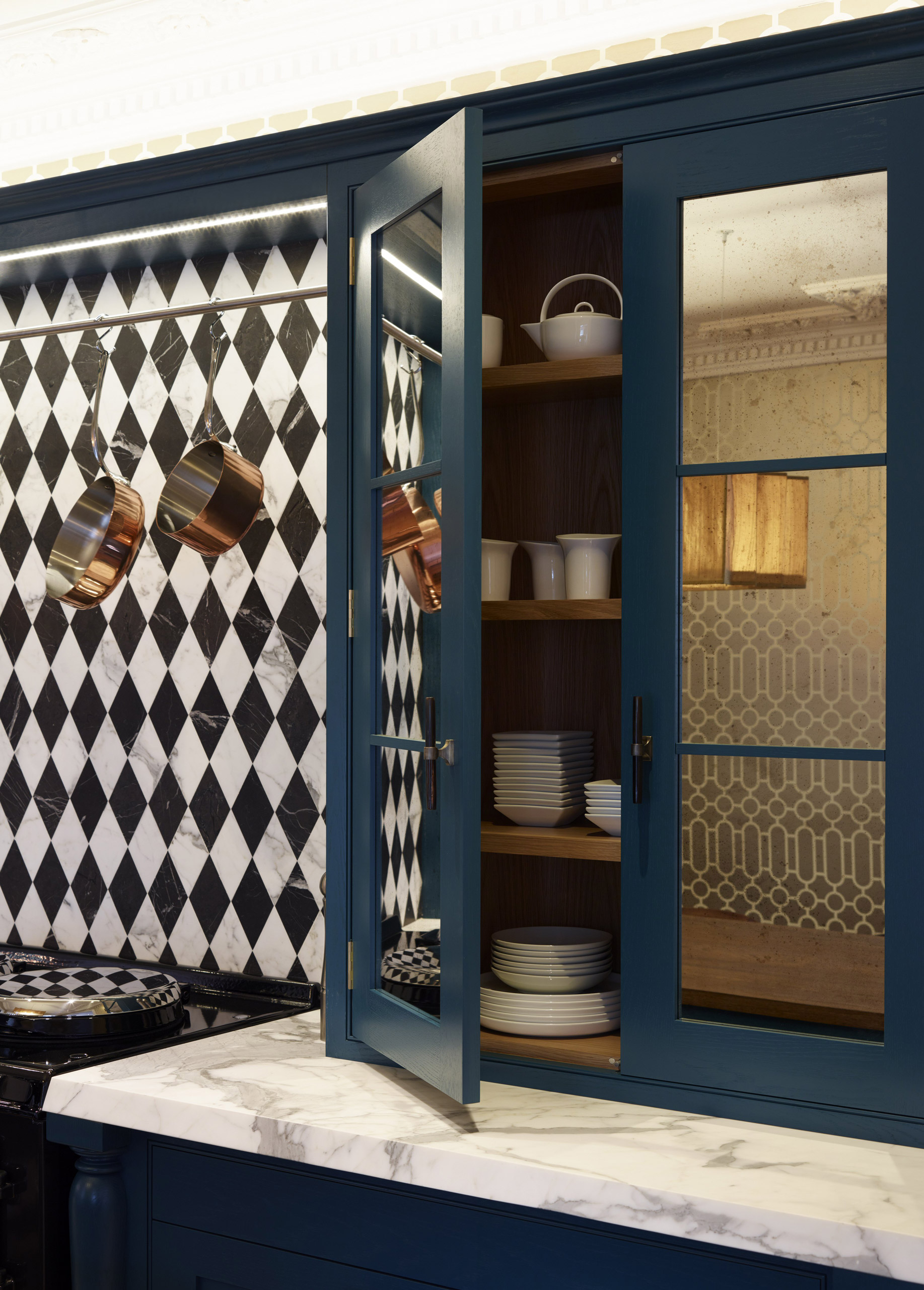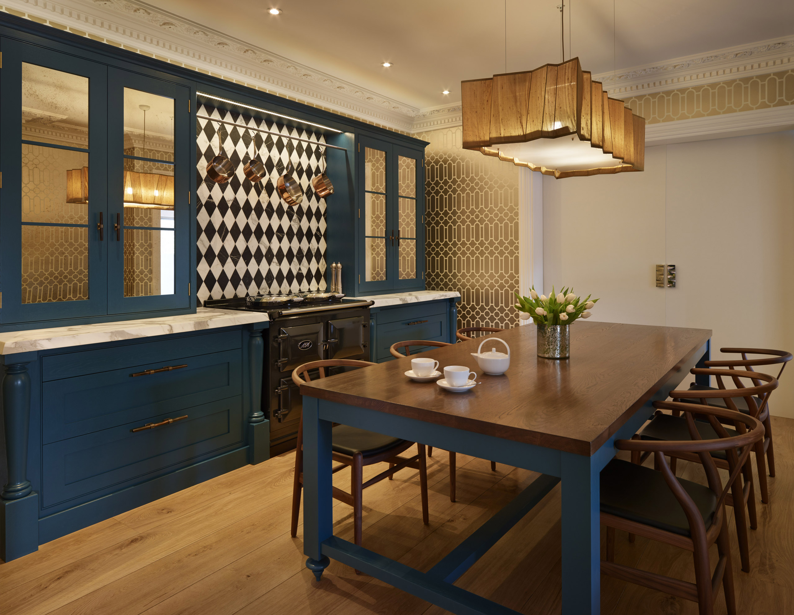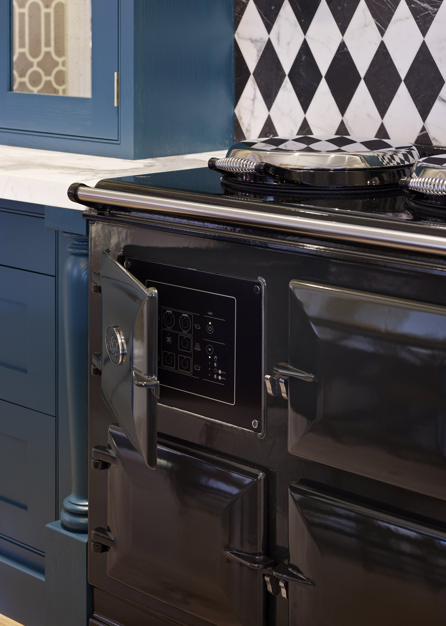 The perfect combination of modern and traditional in this kitchen with AGA. The hand-painted, shaker style drawers, paired with the timeless AGA, balance the contemporary, honed marble work surfaces, creating a more accessible, friendlier living space for socialising and cooking.