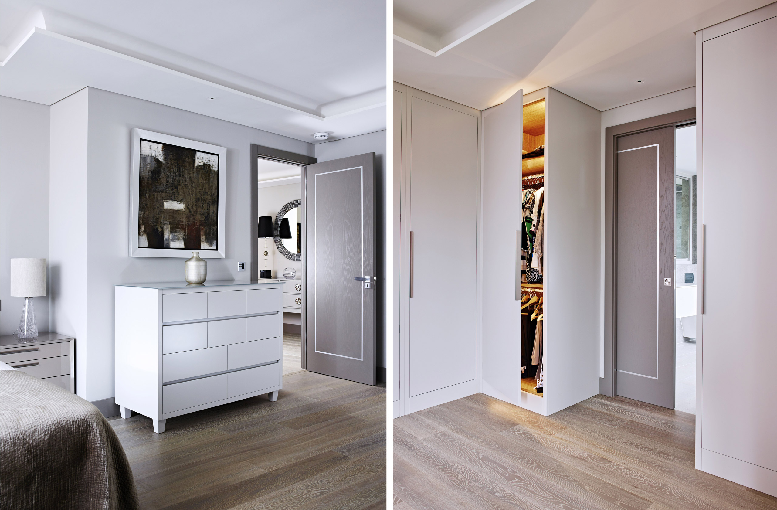 Vertical rebated LED lighting illuminates wardrobe interior, operating automatically each time the doors are opened. Full height, white lacquered made to measure wardrobes seamlessly flow with the path of the architectural coffered ceiling above.