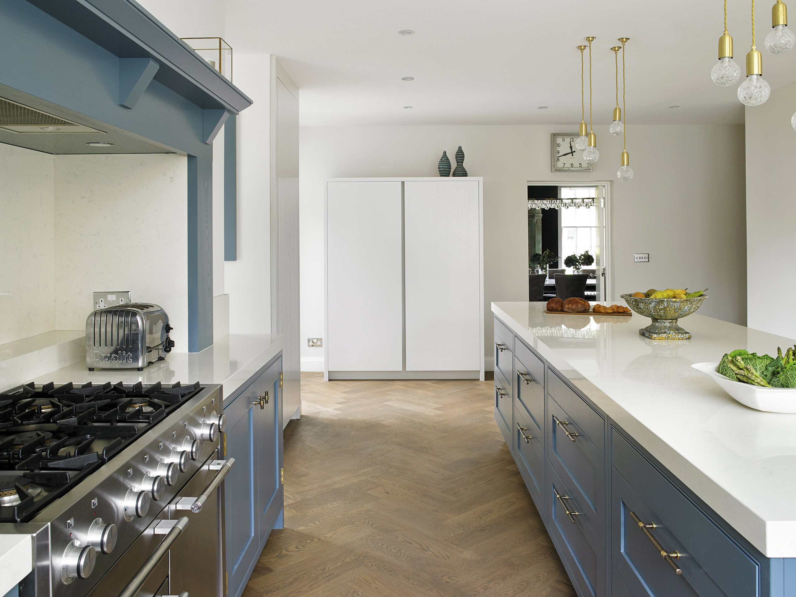 Beautiful tones of blues in this traditional shaker style kitchen. Although traditional, this blue kitchen also features contemporary, sleek, streamlined handleless cabinetry and the deep soft-close drawers provide ample storage within the island, meaning you can keep all the essentials close at hand.