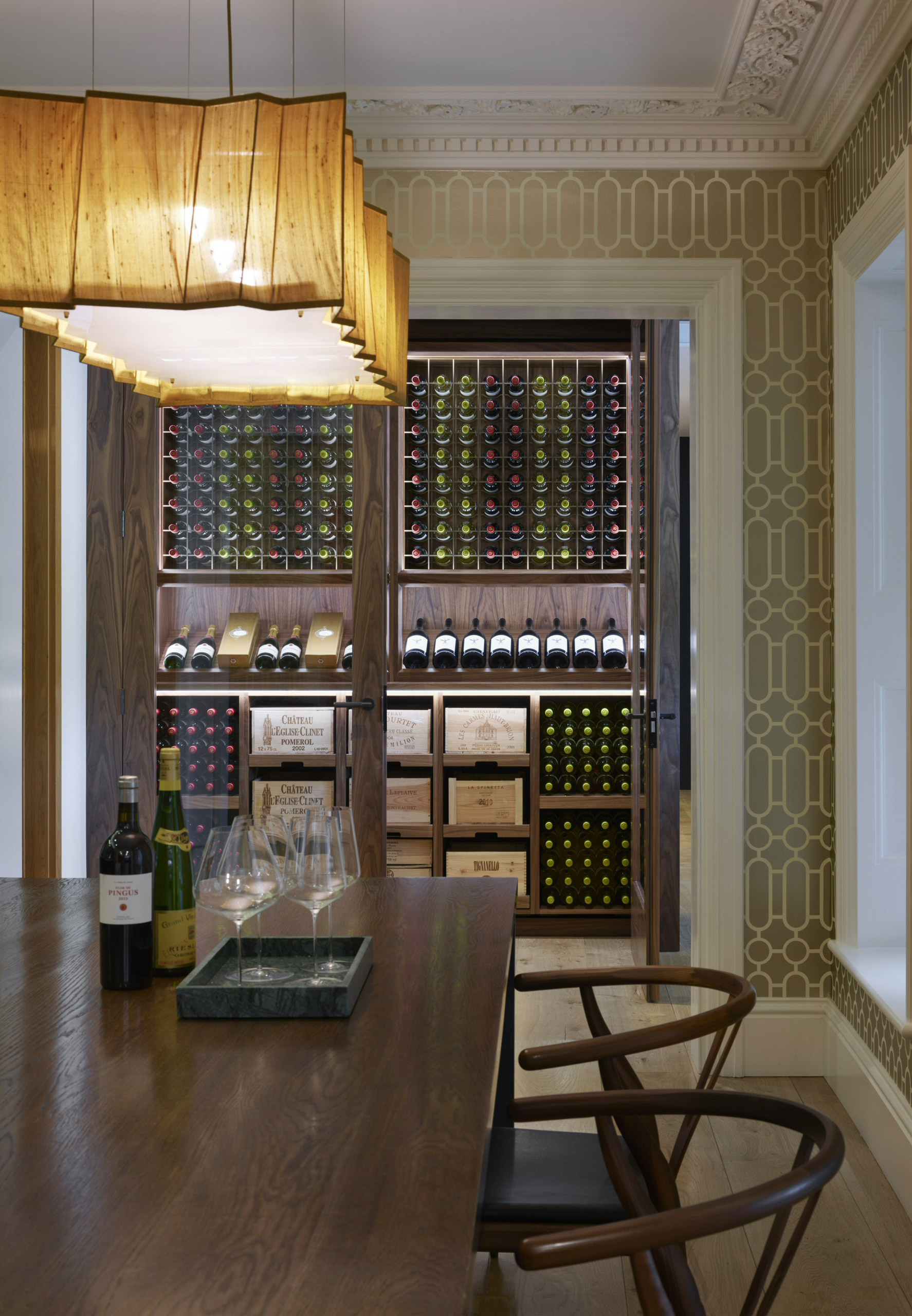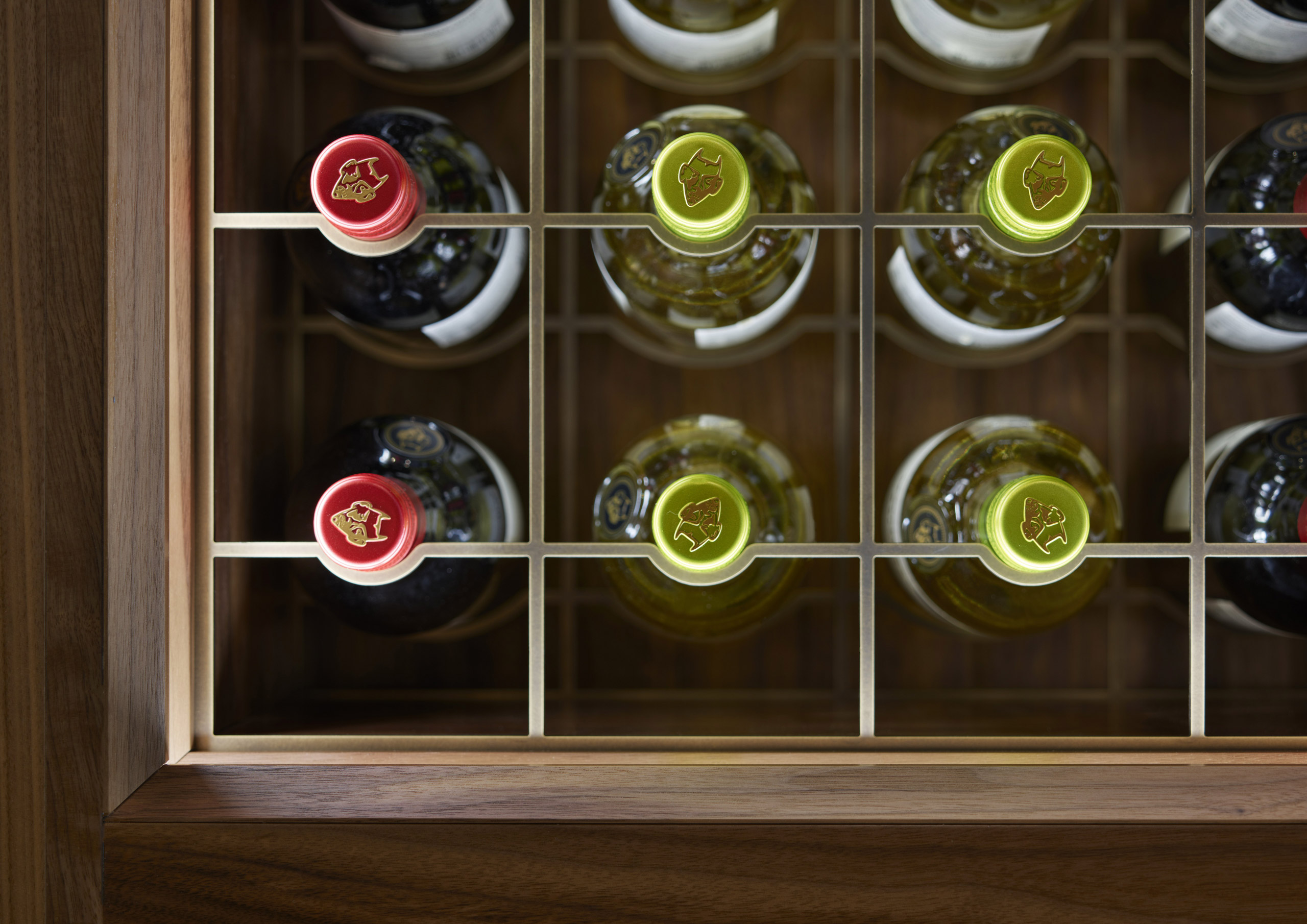Lasercut bronze wine display cabinets are set into picture-framed Walnut and backlit with LED lighting to create a stunning showcase for this wine collection. Triple glazed doors and sealed units ensure the perfect conditions for wine storage.