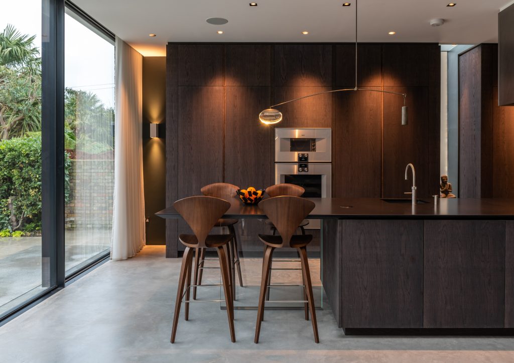It is shaped by what feels instinctive within the space. Some find reassurance in symmetry and concealed storage – retractable doors closing away appliances at the end of the day, worktops cleared in moments. Others feel more at ease when everyday objects remain visible: ceramics on open shelving, glass jars aligned along timber boards, daily ritual woven into the joinery itself.