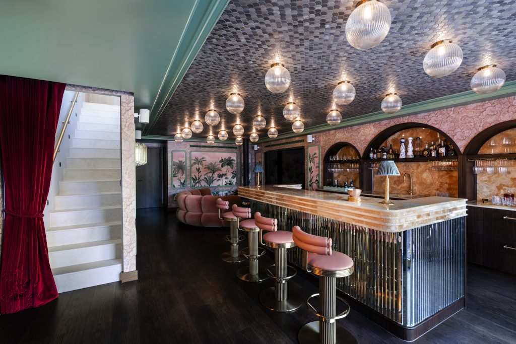 At its centre, a bespoke bar introduces a richer palette of materials. Backlit onyx forms a striking focal point, framed by bevelled antique mirrored panels and stained walnut. It is a space that feels atmospheric without excess – equally suited to spontaneous evenings or more considered gatherings.