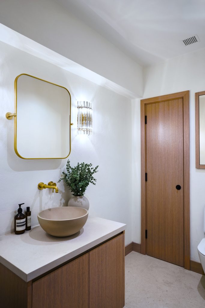 Finished in an oak-stained clay tone, the joinery brings warmth and continuity across the suite – creating an environment that feels balanced, grounded and quietly resolved.