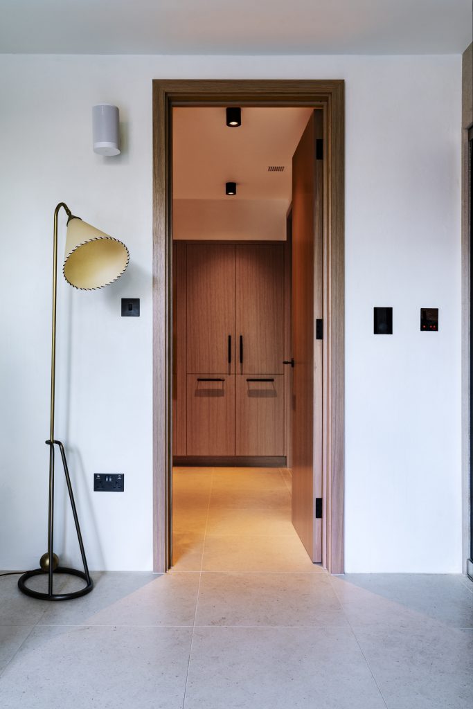 The gym lies at its core, shaped around the family’s differing routines. Bespoke mirrored panels and cabinetry are tailored to specific equipment, ensuring that the space supports performance without ever feeling clinical.